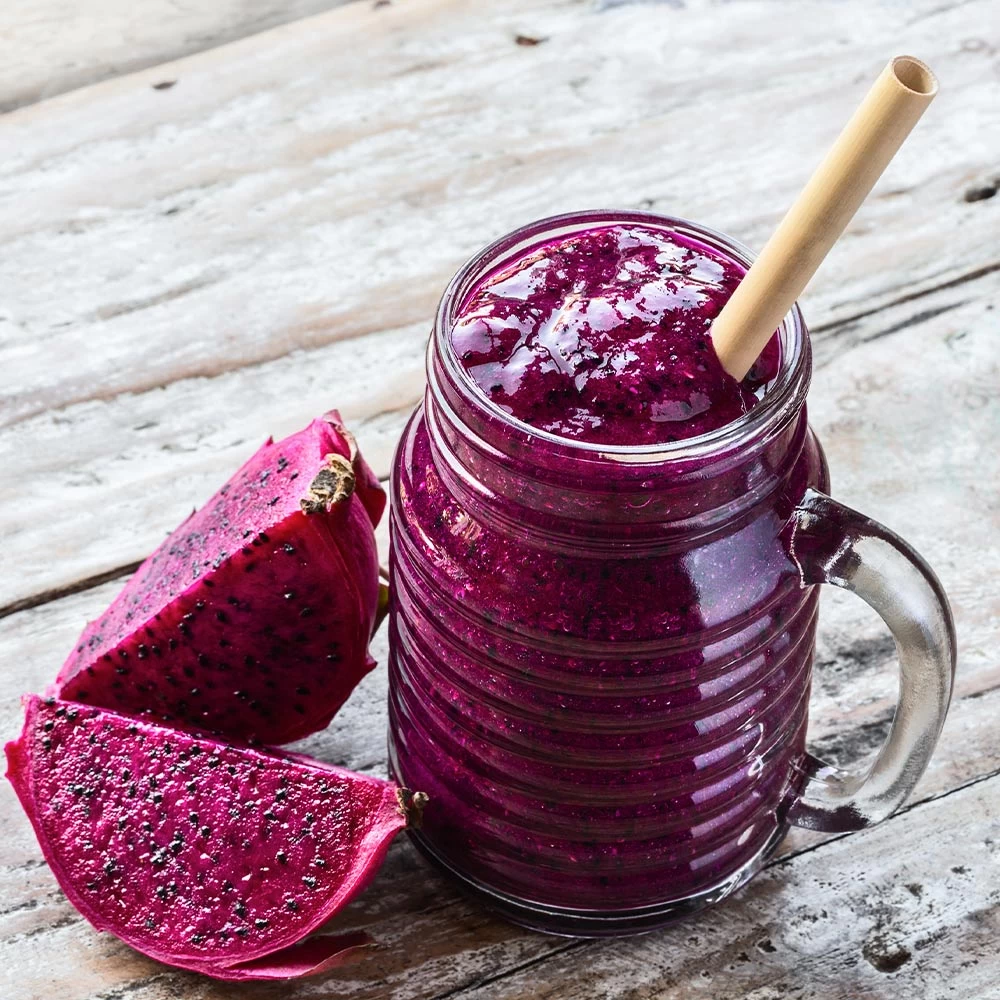 Flowers develop into the American Beauty’s signature magenta fruits, which can weigh up to a pound. The American Beauty Dragon Fruit has a hot pink exterior with green scales, and red inner flesh is dotted with edible black seeds. The tropical, exotic fruit is perfect for eating fresh or incorporating into juices or smoothies.